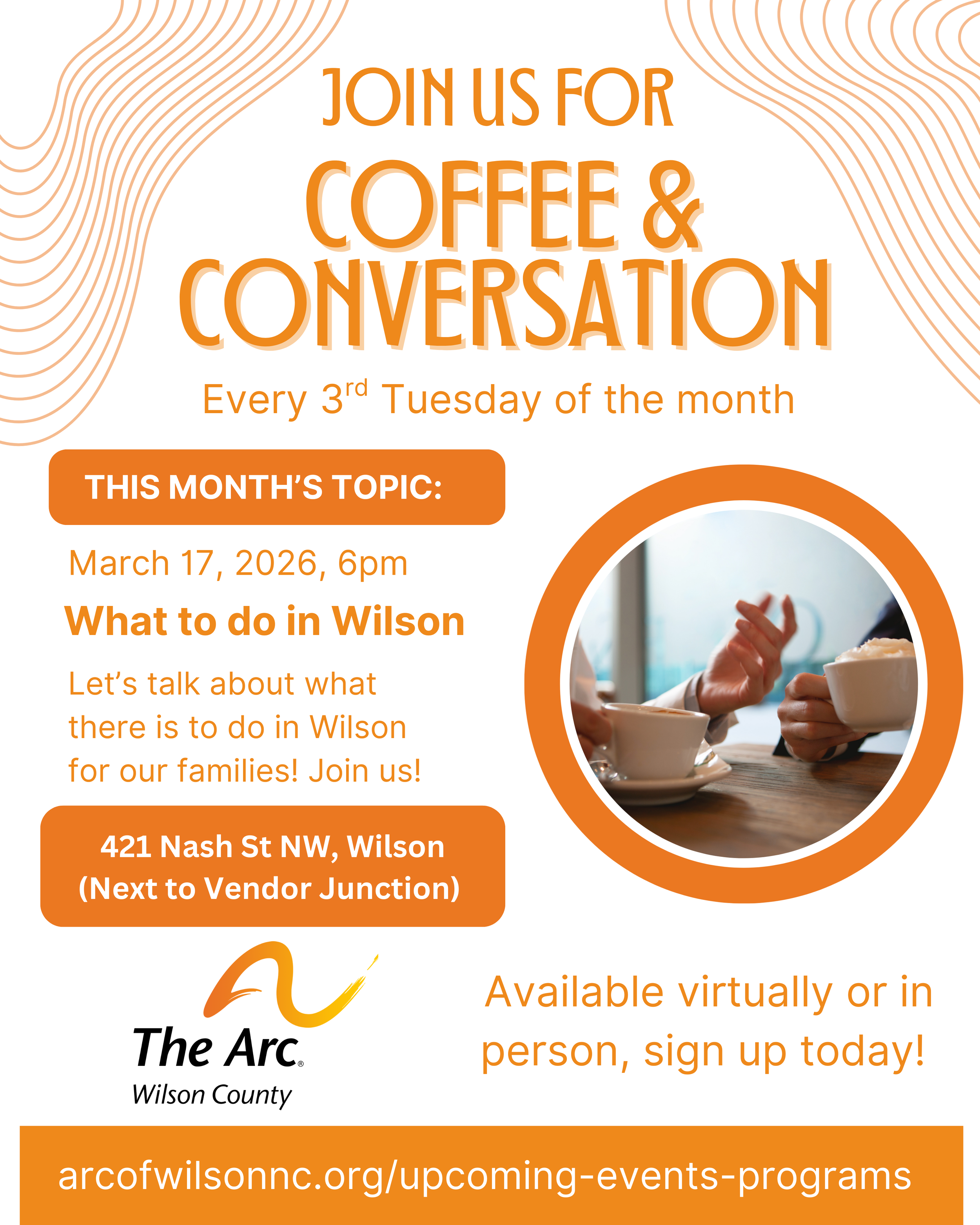 Due to the treat of inclement weather, The Arc of Wilson County has canceled the remainder of programming for Monday, March 16, 2026 to ensure the safety of our families and participants. Programming will resume tomorrow morning.